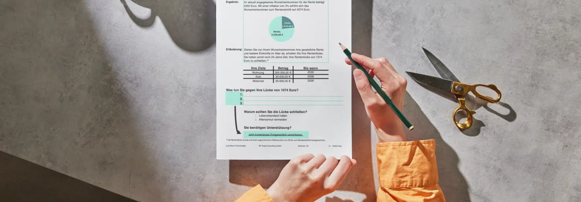 Haben Sie eine Frage zur Rentenlücke? Oder möchten Sie, dass Ihr persönlicher Finanzcaddy Ihre Rentenlücke berechnet? Dann zögern Sie nicht, ihr persönliches Formular zum Rentenradar auszufüllen oder uns telefonisch unter der Nummer (+49) 7131 206 80 50 zu kontaktieren.